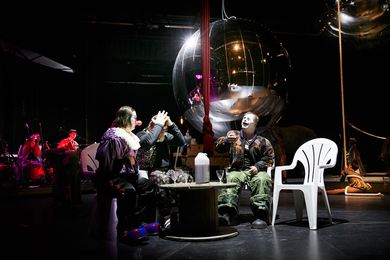A planet with a dead ecological system in a world in which all theatres have been abandoned: Only a flying circus remains to preserve the bold dreams of long-gone humans in its carnivalesque archive. This “aerocircus” conjures up the image of beings without fixed boundaries or limits, which need to be constantly investigated and explored anew. In a double-floored circus ring, a tomorrow that is no longer populated by humans is envisioned with the goal of being able to somehow influence the lost future. As time goes by, the circus artists – acrobats and tightrope walkers, clowns and mimes – begin to view our overheated planet as an artistic challenge and gradually grow to accept the ruined planetary habitat. As portrayed by the actors from the RambaZamba Theater, the circus artists perform their acrobatic feats inside a series of installations created by the internationally renowned visual artist Tomás Saraceno. His spatial designs lend evidence and visibility in a striking manner to the web of life that binds both the human and non-human inhabitants of our planet.